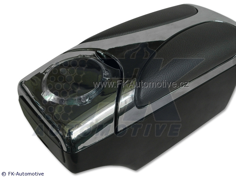 Odkládací schránka - opěrka, černý design, protiskluzový gumový materiál + plast, součástí držák na plechovku a box na brýle, modré LED podsvícení, universální použití. Cena je za kus.