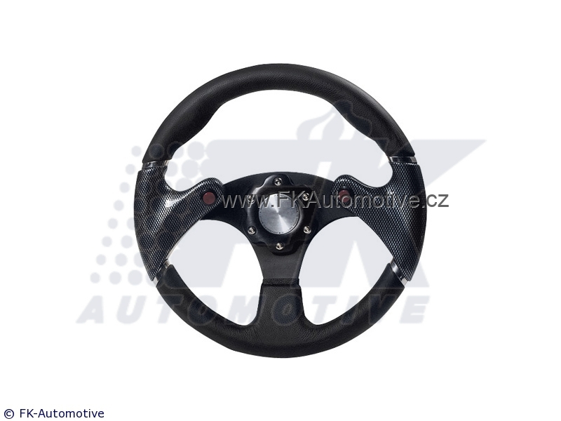 Sportovní volant, pravá kůže, černý design, ergonomický tvar, průměr 350mm.
