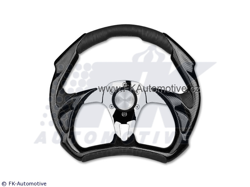 Sportovní volant, pravá kůže, černý design, ergonomický tvar, průměr 350mm.