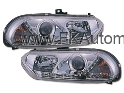 Přední světla s LED pruhem denního svícení, styl Devil Eyes na Alfa Romeo 156 tyo 932, r.v. 98-02, chromové pozadí, integrovaný blinkr. Cena je za pár.