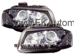 Přední světla s LED pruhem denního svícení, styl Devil Eyes na Audi A3 typ 8P, r.v. 03-07, černé pozadí, integrovaný blinkr. Cena je za pár.