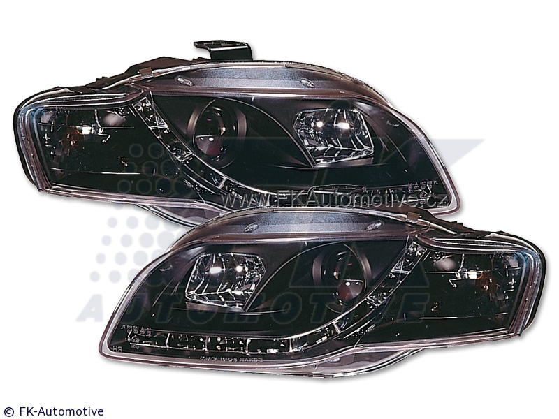 Přední světla s LED pruhem denního svícení, styl Devil Eyes na Audi A4 typ 8E, r.v. 05-07, černé pozadí, integrovaný blinkr. Cena je za pár.