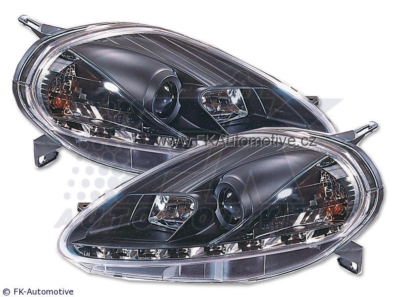 Přední světla s LED pruhem denního svícení, styl Devil Eyes na Fiat Grande Punto typ 199 3dvéř. r.v. 08-, černé pozadí, integrovaný blinkr, s el. naklápěním. Cena je za pár.