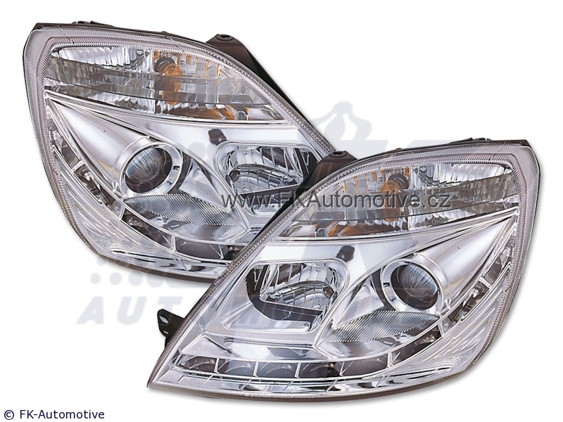 Přední světla s LED pruhem denního svícení, styl Devil Eyes na Ford Fiesta typ MK6 r.v. 03-07, chromové pozadí, integrovaný blinkr, el. naklápění. Cena je za pár.