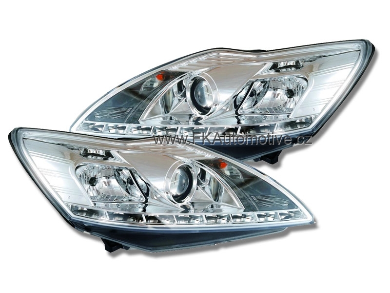 Přední světla s LED pruhem denního svícení, styl Devil Eyes na Ford Focus 3/5dvéř. r.v. 08-, chromové pozadí, integrovaný blinkr, manuální ovládání naklápění. Cena je za pár.