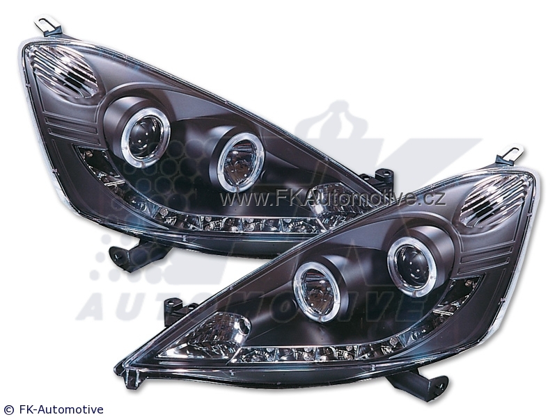 Přední světla s LED pruhem denního svícení a kroužkem, styl Devil Eyes na Honda Jazz r.v. 08-, černé pozadí. Bez homologace. Cena je za pár.