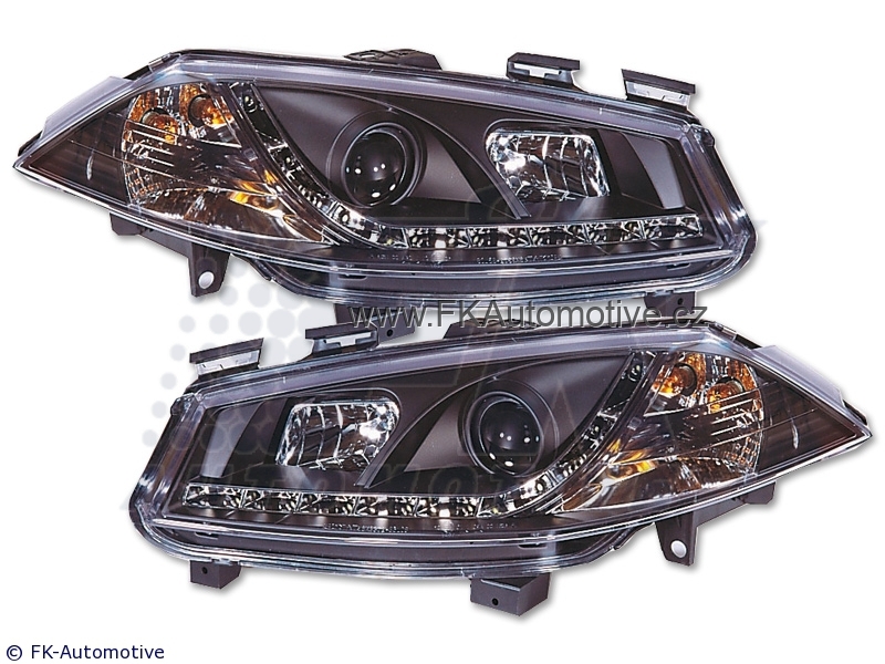 Přední světla s LED pruhem denního svícení a kroužkem, styl Devil Eyes na Renault Megane 3/5dvéř.. r.v. 03-06, černé pozadí, integrovaný blinkr. Cena je za pár.