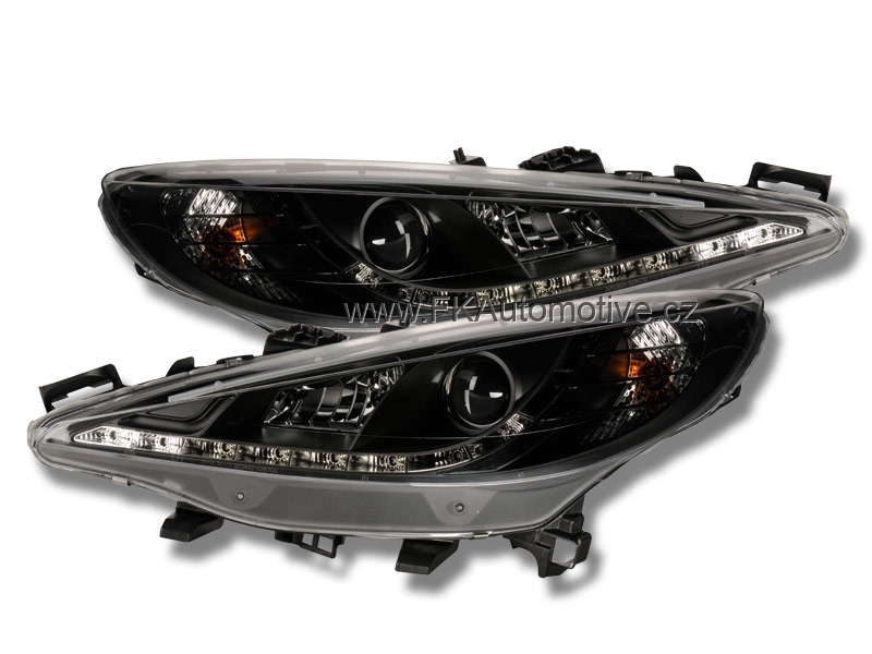Přední světla s LED pruhem denního svícení, styl Devil Eyes na Peugeot 207 r.v. 06-, černé pozadí, integrovaný blinkr, manuální ovládání naklápění. Cena je za pár.