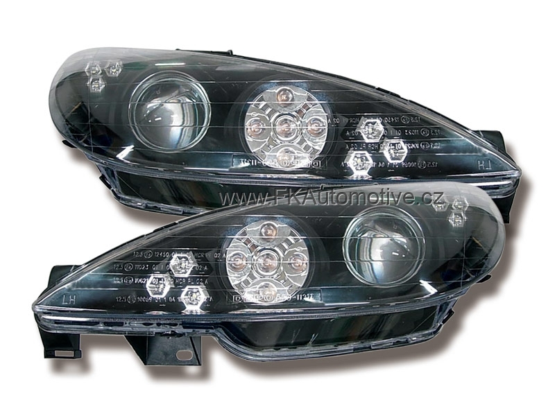 Přední světla s LED pruhem denního svícení, styl Devil Eyes na Peugeot 206 r.v. 98-05, černé pozadí. Cena je za pár.