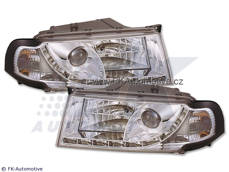 Přední světla s LED pruhem denního svícení, styl Devil Eyes na Škoda Octavia r.v. 91-04, chromové pozadí, integrovaný blinkr. Cena je za pár.