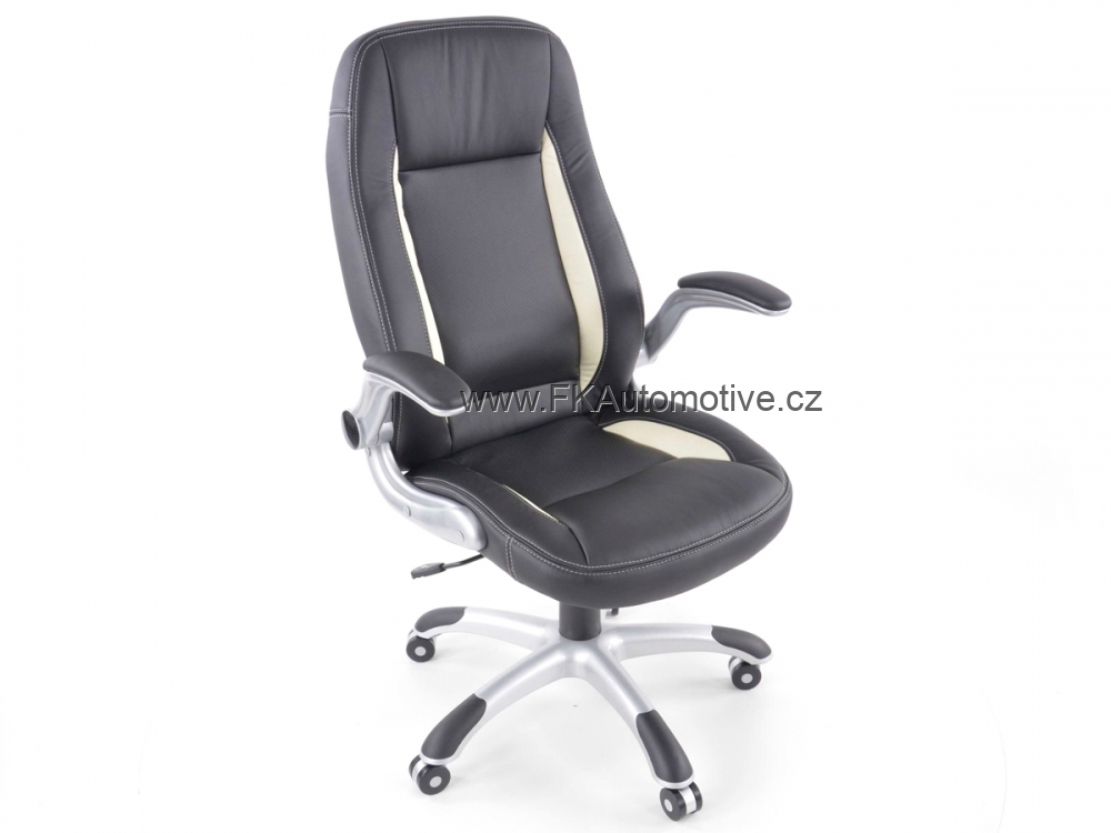 Sportovní kancelářská židle s opěrkami pro závodní pocit v kanceláři, otočná, materiál polokůže + pvc, nastavitelná výška opěradla, barva černá+bílá, včetně nastavitelných područek. Max. nosnost 110kg, kovová základna.