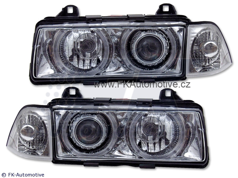 Přední světla Angl Eyes na BMW E36 Coupé, r.v. 92-98, chromové pozadí, včetně blinkrů. Homologace E. Cena je za pár.
